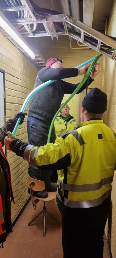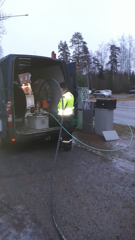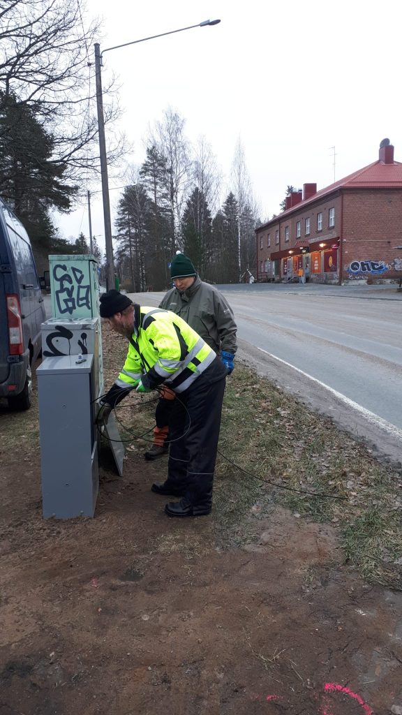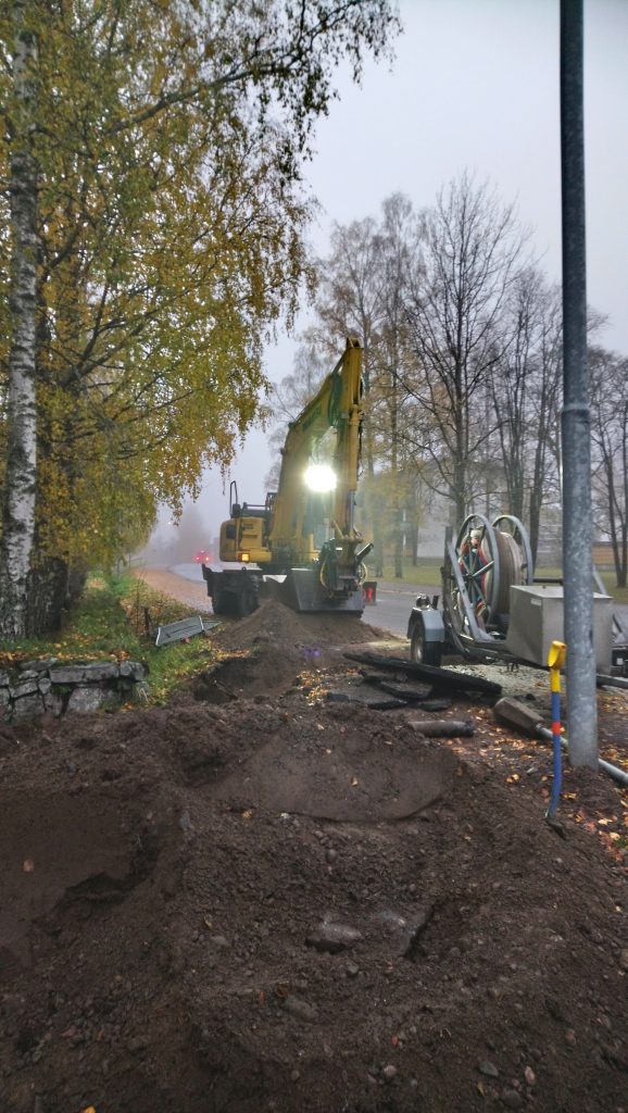 Varikolle menevän kuitulinjan rakentamista marraskuussa 2020Kuidun puhallusta kirkonkylällä joulukuussa 2021Töitä Launosissa joulukuussa 2021Kuitutöitä Launosten keskustassa joulukuussa 2021. Kuitu on juuri ennen kuvaushetkeä puhallettu Launosten koululta Pehtoorintielle. Kuitutöitä Launosissa. Peräkärryssä on kuidun puhallukseen tarvittava kompressori, kaapelikela ja puhalluslaite pakettiautossa.